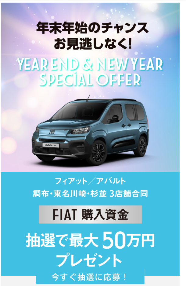 今年もいよいよ年末年始の特別な季節がやってきました。FIATではこの期間限定で、とってもお得なスペシャルキャンペーンを開催いたします!🎁抽選で最大50万円分の...