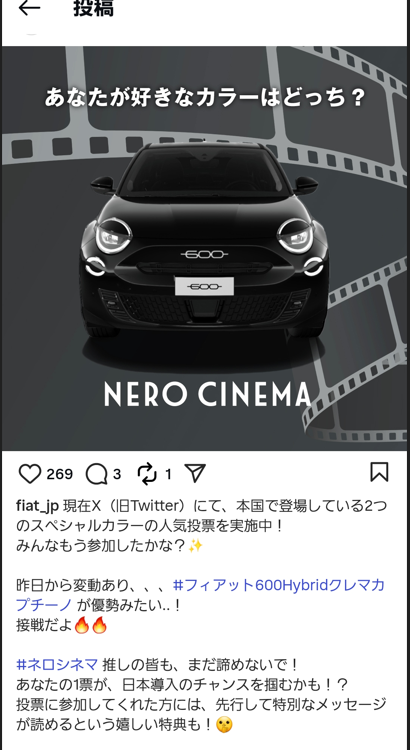 FIAT公式インスタグラムはフォローしていただいてますでしょうか?イタリア本国ではクレマカプチーノとネロシネマどちらのほうがいいか人気投票中のようです!現状カプ...